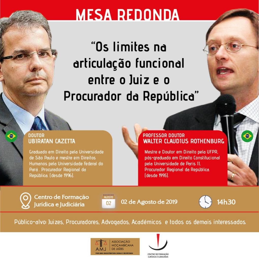 A AMJ no âmbito das suas actividades vai realizar no dia 02 de Agosto de 2019 pelas 14H30, uma mesa Redonda, subordinada ao tema “Os limites na articulação funcional entre o Juiz e o Procurador da República” palestrada pelo Professor Doutor WALTER CLAUDIUS ROTHERNBURG e o Doutor UBIRATAN CAZETTA. O Venerando Conselheiro do Tribunal Supremo ANTÓNIO NANBURETE, será moderador. Estão todos convidados a participar, a hora supra indicada no Centro de Formação Jurídica e Judiciaria (CFJJ) na Matola.